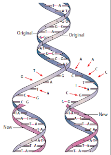 Double helix of DNA and its duplication (replication). The double strand of DNA splits like a zipper and forms two new, completely identical DNA molecules. The original strands are shown in blue, the new ones in pink (the sugar−acid phosphate chain is shown as a band; A = adenine, C = cytosine, G = guanine, T = thymine; free nucleotide groups are marked by arrows) (After Hadorn and Wehner)